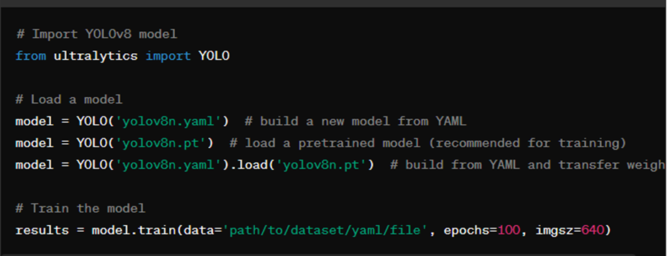 model = YOLO('yolov8n.yaml')model = YOLO('yolov8n.pt')model = YOLO('yolov8n.yaml').load('yolov8n.pt')Choose the method that best suits your requirements and training objectives. Each method offers its own advantages and can be tailored to your specific use case.